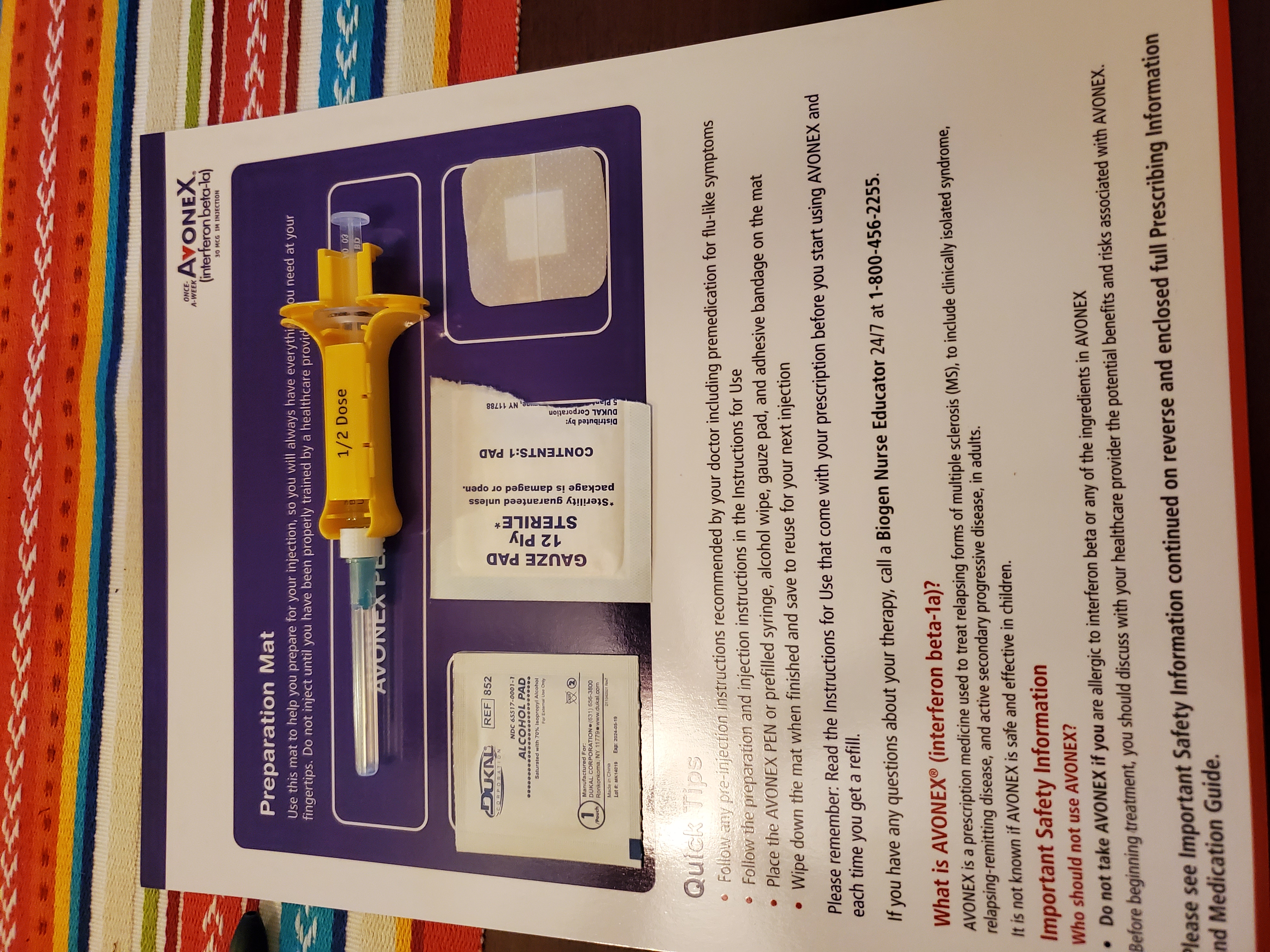 The start of Avonex had me injecting only 1/4 dose with an increase of an additional 1/4 dose until the fourth week when I use the recommended dosage. The shot is injected once a week. I usually like to administer this type of medication on Fridays. One of the side effects is flu-like symptoms. Friday injections allows me to recover over the weekend, if I was to experience any side effects. The last time I started an injection medication the side effects didn’t hit me until the middle of the week. I had to be wheel out of work in a wheelchair, which I do not use, and driven home by my coworkers. My body locked up and I couldn’t even walk or bend my legs. What a day that was. Took a couple of Aleve and was back in busy a few hours later. Everyone was freaked out though. Especially my boss. Couldn’t return to work without a doctor’s note. Lol. I don’t blame her.